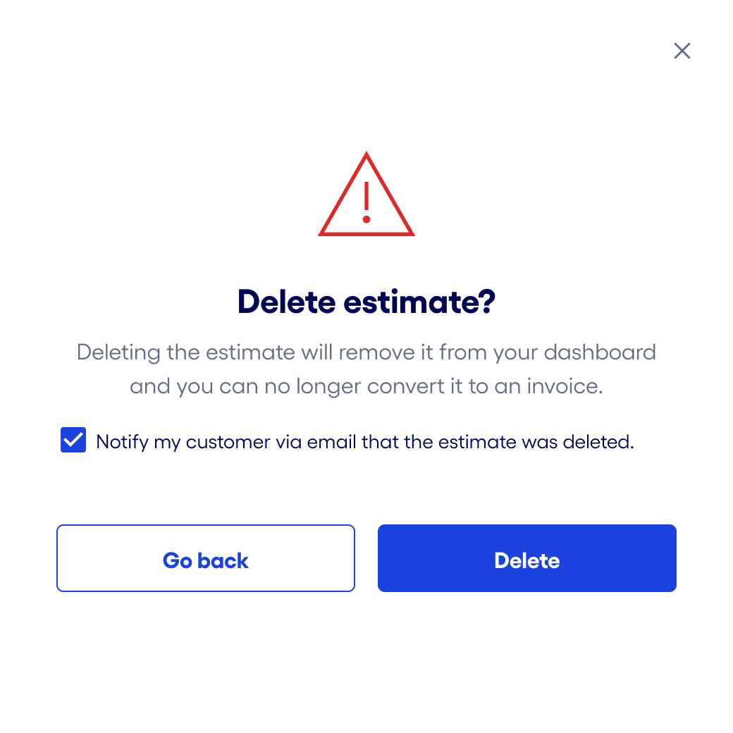 InformationBodyOverview Estimates let you send professional quotes or proposals to your customers before you send an invoice. You can create, send, track, and convert estimates directly from your Bluevine dashboard. If your customer accepts your estimate, you can turn it into an invoice in just a few clicks — no need to start from scratch. Before You Begin This feature does not require a Stripe connection. Important: If an estimate is converted into an invoice, a Stripe connection is recommended for the payment gateway to appear in the invoice. Estimates are available on all Bluevine plans. You can add up to 20 items per estimate. You can’t backdate an estimate or edit it after sending. How to Create an Estimate Log in to your Bluevine dashboard. From the navigation panel, select Sales → Estimates. Click Create Estimate. Fill out the estimate details: Logo (optional): Select Add Logo to include a company logo within Estimate. Upload the logo file and select Next to continue or Cancel to return to the estimate. Adjust logo as needed and select Save to continue or Go back to return to the estimate. Note: if you already have a logo added, it will show here. Customer: Choose existing or create a new one. Date: Add an issuance date for the estimate. This defaults to today (can’t select past dates). This should be a date before the expiration date. Auto-reminders (optional): Add one reminder for Standard plan users and up to four for Plus or Premier users. For more details on how auto-reminders work, refer to How do I manage Invoice and Estimate Auto-Reminders? Expiration date: Choose a date for the estimate to expire; this date needs to be a future date and shouldn’t be the same as the issuance date you chose. Quickly select by using net terms for 30, 60, or 90 days. Custom field (optional): Add a new field and value for additional customization. Available only to Plus or Premier plan users. For more details on how custom fields work, refer to How do I add Custom Fields to an Invoice or Estimate? Note to customer (optional): Use this to provide additional context or details to your customer. Add item(s): Choose from existing items or create a new one. Add up to 20 items. Service Charge (optional): Add a fee to your estimate. For more details on how Service Charge works, refer to How do I manage an Invoice and Estimate Service Charge? Note: This feature may not be available to all customers yet. Discount (optional): Add a discount to your estimate. For more details on how Discounts work, refer to How do I add a Discount to an Invoice or Estimate? Upload attachment (optional): Select Upload attachment to include an attachment in the estimate. Accepted Formats: PNG, JPG, or PDF with a max file size of 20 MB. Click Preview & Send. Choose how you’d like to share the estimate: Email: Select Email, review, and confirm the estimate details. (Optional) CC: add up to 10 email addresses to be CC’d. Tip: Include your email address to receive a copy. Select Send email when ready to send the estimate. This email will contain both a link to the estimate that the customer can approve/decline and a PDF attachment of the estimate. Note: The estimate will be sent immediately after selecting Send email. Unique URL: Select Unique URL, review, and confirm the estimate details. Select Create estimate link when ready to create. Note: This method will not automatically send the estimate to your customer. Copy the link and send it to your customer using your preferred method of communication. PDF: Select PDF, review, and confirm the estimate details. Select Create PDF when ready to create. Note: This method will not automatically send the estimate to your customer. Download the PDF and share it with your customer using your preferred method of communication. SMS: Select SMS, review, and confirm the estimate details. Important: The first time sending an SMS to your customer, we will ask if you have consent to send an SMS. Check the box to confirm. If consent has already been given, we will not ask for it again. Select Send SMS when ready to send the estimate. Note: The estimate will be sent immediately after selecting Send sms. Select Done to complete creating estimates or Create another if more are needed. What to expect next: your customer will be able to accept or decline the estimate if shared with them via email, SMS, or URL. You’ll receive an email confirmation when your customer accepts or declines an estimate. If your customer accepts the estimate, you will need to convert it into an invoice when ready to send as an invoice. Important: an accepted estimate does not automatically become an invoice. If your customer declines the estimate, they will be able to provide details as to why they are declining. This will be listed in the decline email. Decline reasons can also be found in details panel of the applicable estimate. For PDFs you will need to manually update the status to reflect if a customer accepts or declines the offer. Continue with the following processes depending on your needs: Manually update estimate status Duplicate Estimate Delete Estimate Converting an estimate to invoice Manually update Estimate status Your customer has the ability to accept or decline an estimate when it is sent via email, link, or SMS. Estimates sent as a PDF will not have this option. You can manually update if the estimate was accepted or declined. Only estimates in the Sent status can be marked as accepted or declined. From the navigation panel, select Sales → Estimates. Find and select the applicable estimate. In the details panel, find the quick actions menu and select Mark accepted or Mark declined. The status of your estimate will be updated accordingly. Duplicate estimate Easily create a duplicate of your estimate so that you don’t have to manually create it each time and add minor changes as needed. From the navigation panel, select Sales → Estimates. Find and select the applicable estimate. In