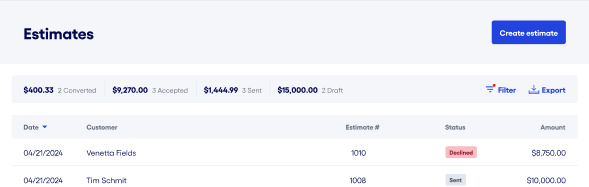 In this article:OverviewHow to Create an EstimateManually update Estimate statusDuplicate estimateDelete an EstimateConverting an Estimate to an InvoiceUnderstanding your Estimates dashboardFiltering and Exporting EstimatesFAQs