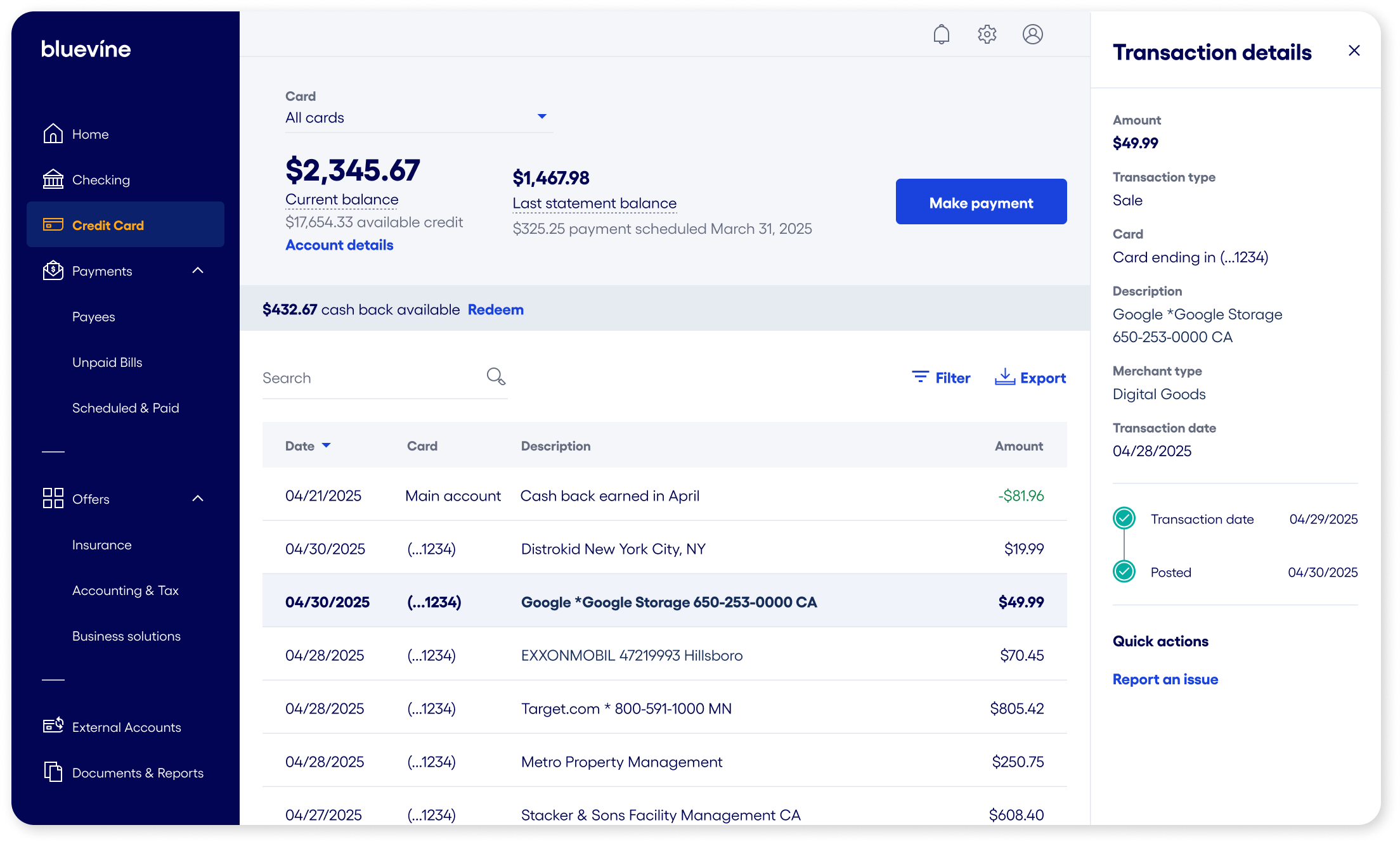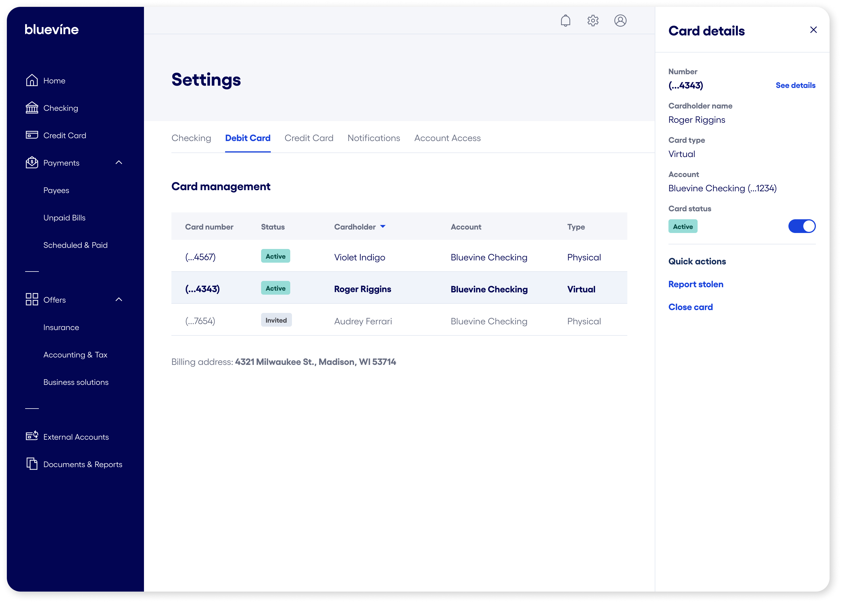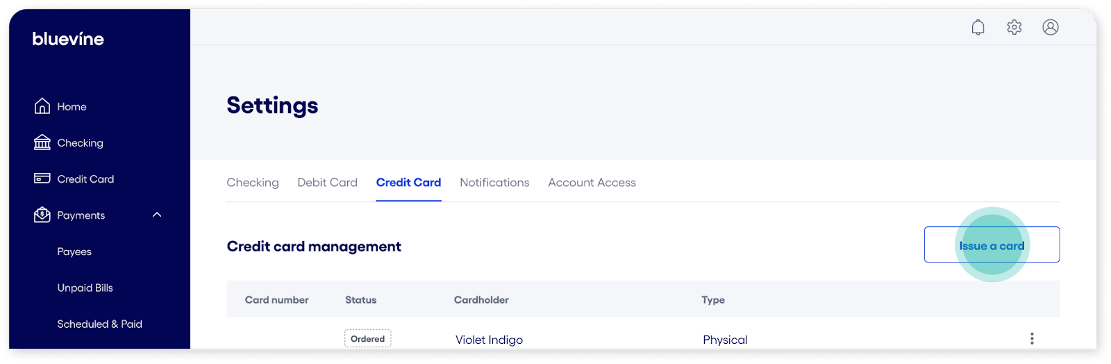 How do I issue and manage my Bluevine debit and credit cards?