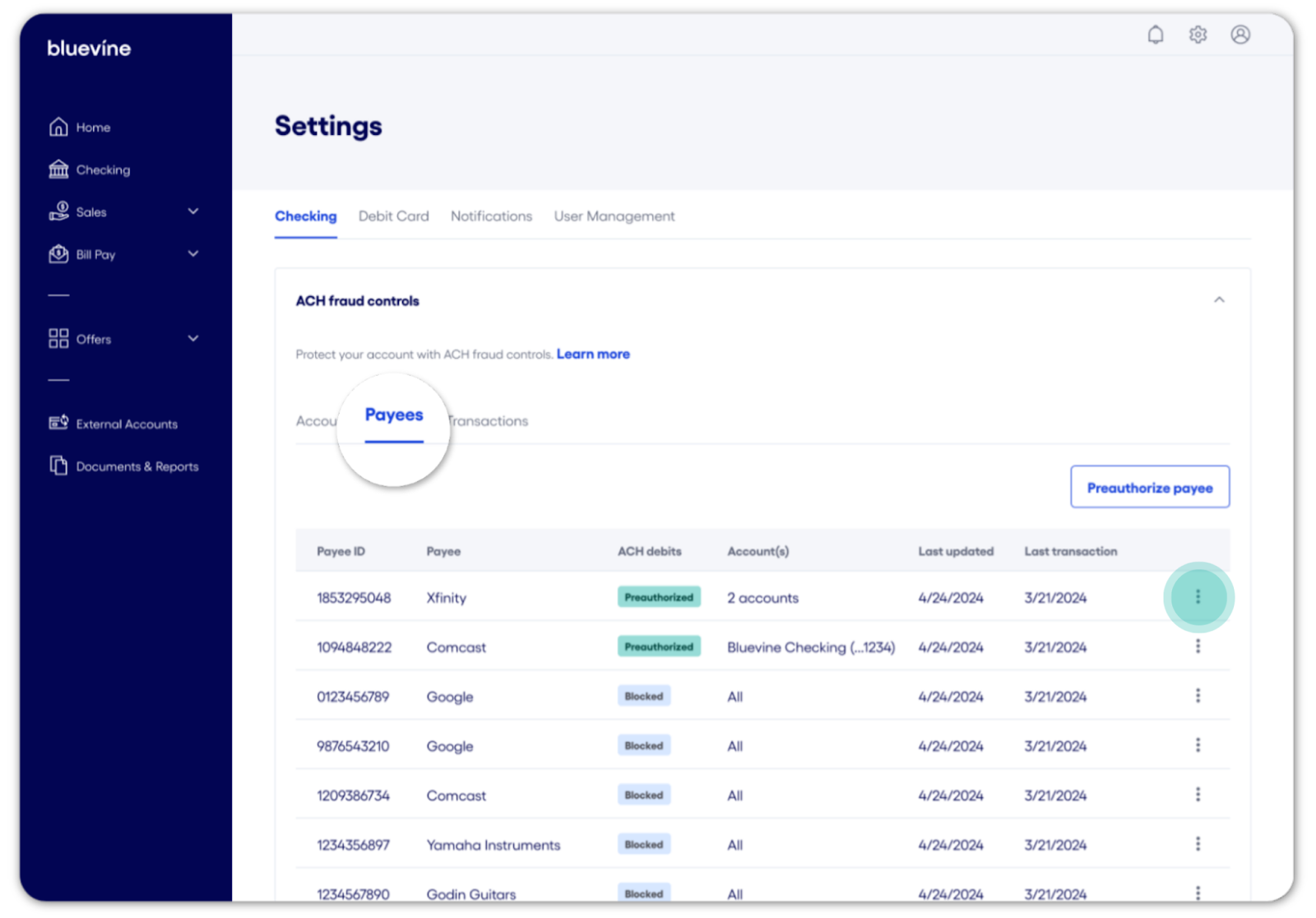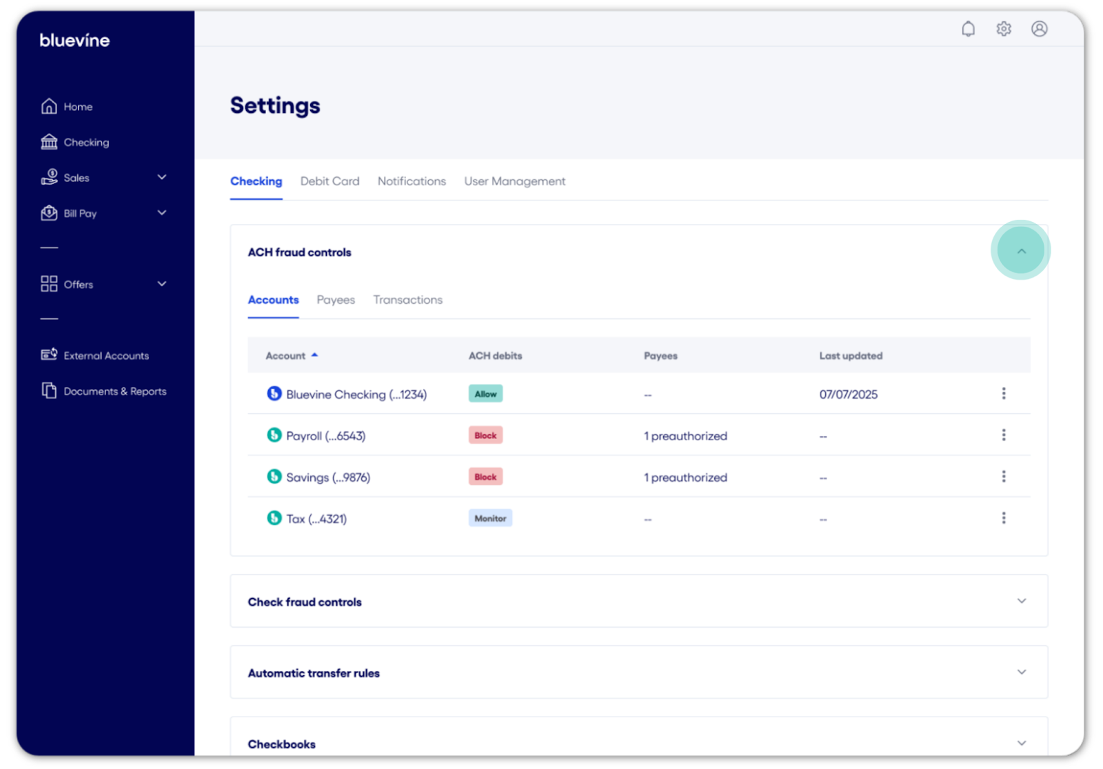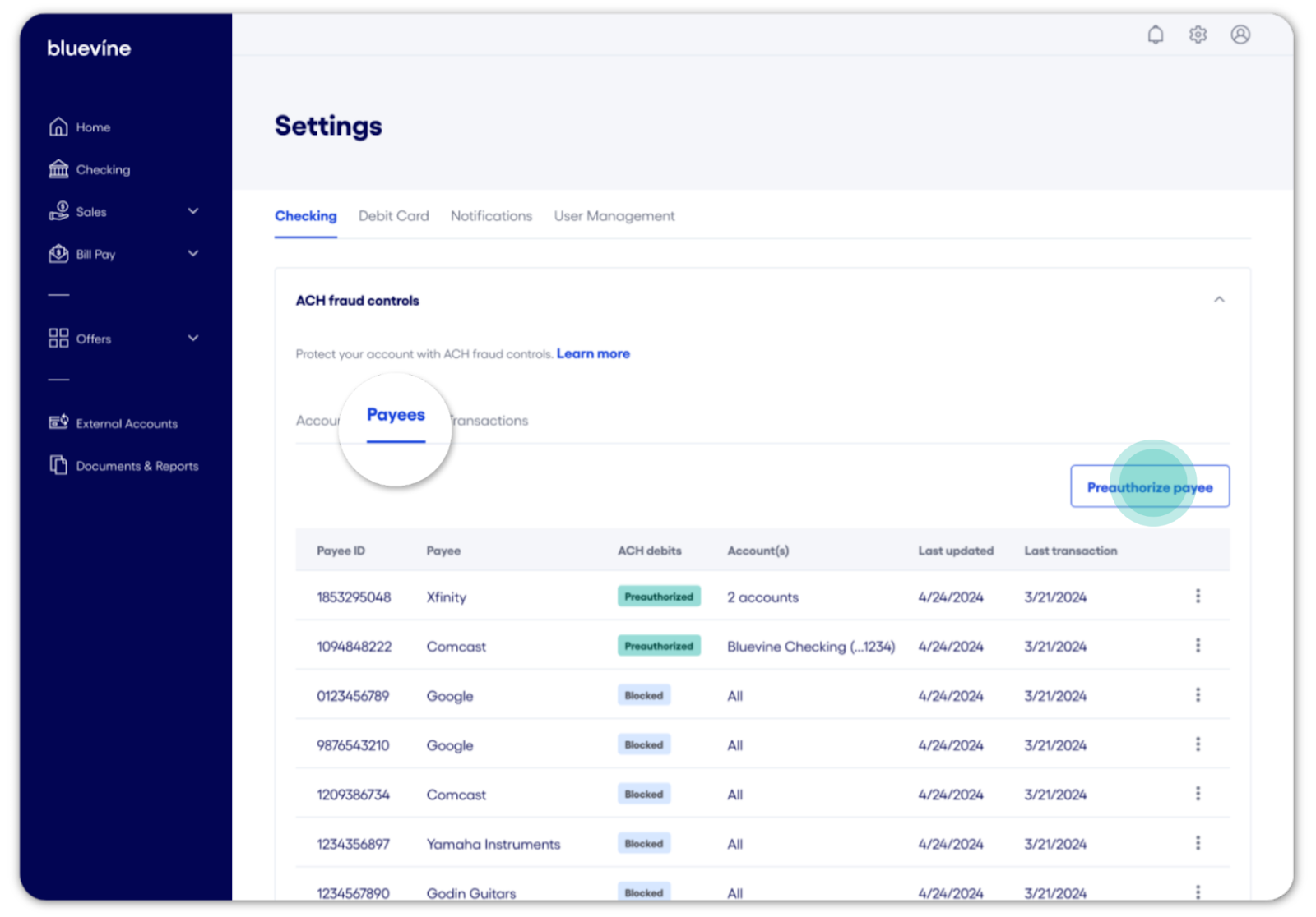 InformationBodyWith Bluevine Business Checking, you can safeguard your accounts against unauthorized or unwanted charges using ACH fraud controls. From your Bluevine dashboard, you have the ability to configure custom ACH debit settings and permissions both on the account level and by payee, giving you more control over how and when your accounts are debited. Account-level ACH fraud controls Account-level ACH controls allow you to designate how each account/sub-account handles ACH debits generally (allow/block) or set ACH amount limits that trigger your review (monitor): Allow: All ACH debits are paid unless the payee is on your blocked list or the account doesn’t have enough funds.Block: All ACH debits are automatically returned unless you’ve specifically pre-authorized that payee and dollar limit.Monitor: Available to Bluevine Premier customers, set dollar-amount triggers for ACH debits to be raised for your review, and rules for how to handle it if you don't take action. How to view account-level ACH fraud controls You can locate your ACH fraud controls settings by following the steps below: Sign in to your Bluevine dashboard via desktop or mobile browser.1 Select the settings icon in the upper right-hand corner. In Settings, select the Checking tab. Select ACH fraud controls to expand the section. How to configure account-level ACH fraud controls Follow the steps below to change how ACH debits are handled by account/sub-account: Sign in to your Bluevine dashboard via desktop or mobile browser.1 Navigate to Settings > Checking > ACH fraud controls. Select the Accounts tab to display a list of your active accounts. Select the vertical ellipsis icon (⋮) next to the account you would like to manage and click View/Edit. Review the available options and select the appropriate setting: Allow, Block, or Monitor. If selecting Monitor, you’ll be prompted to enter a dollar amount that will trigger an ACH debit for your review. You can also designate how we handle review-triggered ACH debits when we don’t hear back from you. Click Continue to apply your new settings. A pop-up screen will appear to confirm the action. Select Done to return to Settings. Payee-level ACH controls In addition to account-level settings for ACH debits, you can block and pre-authorize ACH transactions by the individual payee. Payee-level ACH controls bypass the account’s configured setting when applicable. For example, if you block ACH debits on a sub-account, any pre-authorized payees will still be able to debit the account for the amount allowed, if specified. Conversely, any blocked payees will not be able to debit the account, even if ACH debits are allowed by default. How to block a payee To block a payee, they must have debited any of your account/sub-account(s) at least once. (If the debit was unauthorized, please contact us for assistance disputing the transaction and securing your account.) Blocking a payee will block any future ACH debit attempts from this payee across all account/sub-account(s). Follow the steps below to block a payee from initiating ACH debits: Sign in to your Bluevine dashboard via desktop or mobile browser.1 Select the Checking tab. Locate and select the transaction from the payee you would like to manage to open the Transaction details panel. Under the Quick actions section, select Block future debits. On the pop-up screen, select Confirm to block the payee or Back to cancel the action. Select Done to return to the transactions ledger or Manage account blocks to navigate to your ACH fraud control settings. An email confirmation will be sent to the account Administrator and any Authorized Users. When a payee has been blocked, you can select a corresponding transaction from the Checking transactions ledger to open the Transaction details panel. Within this panel, a note containing information about the ACH debit block will be visible, along with a link to your ACH fraud controls settings. How to view and manage payee-level ACH controls Follow the steps below to view and manage blocked and preauthorized payees: Sign in to your Bluevine dashboard via desktop or mobile browser.1 Navigate to Settings > Checking > ACH fraud controls. Select the Payees tab to display a list of payees with custom permissions. The status indicator adjacent to each payee will indicate if the payee has been blocked or preauthorized. To manage a payee’s setting, select the vertical ellipsis icon (⋮) next to the payee you would like to manage and select the appropriate action. On the pop-up screen, select Confirm to complete the action or Back to cancel. An email confirmation will be sent to the account Administrator and any Authorized Users. How to preauthorize payees Bluevine Plus and Premier plan customers can preauthorize individual payees to bypass account-level ACH blocks. (To preauthorize a payee, ACH debits must be blocked on at least one account/sub-account.) You can set multiple controls for each payee. These controls include the ability to: Select which account/sub-account(s) with ACH debits blocked you would like the payee to debit from Set a maximum debit limit that the payee can debit at once (optional) Follow the steps below to set up and manage payee preauthorization: Sign in to your Bluevine dashboard via desktop or mobile browser.1 Navigate to Settings > Checking > ACH fraud controls. Select the Payees tab. Click the Preauthorize payee button. Fill out the form with the payee’s details and preauthorization settings. Note: The Payee ID, also referred to as the ACH Company ID, can be found in the following ways: If the payee has previously debited the account via ACH, the Payee ID can be located on the transactions ledger within the Checking page. If the payee has not yet debited the account via ACH, please refer to the FAQs below for more information. Select Save to confirm the preauthorization. An email confirmation be sent to the account Administrator when a payee preauthorization i