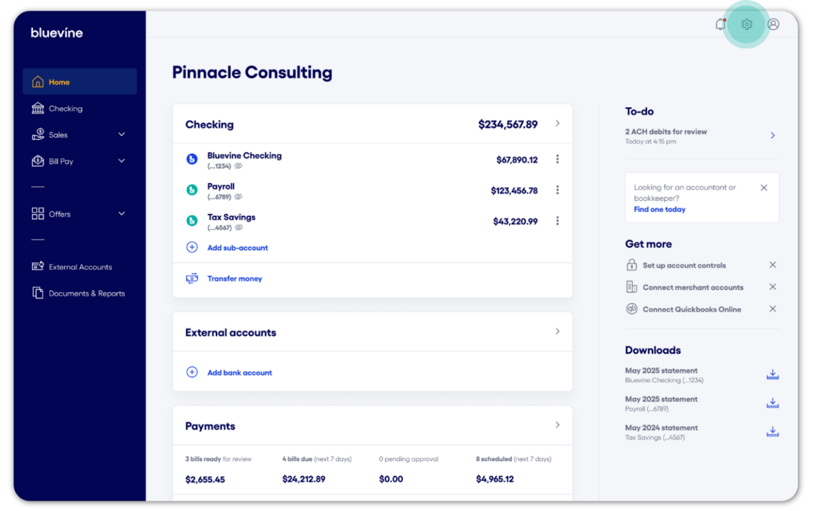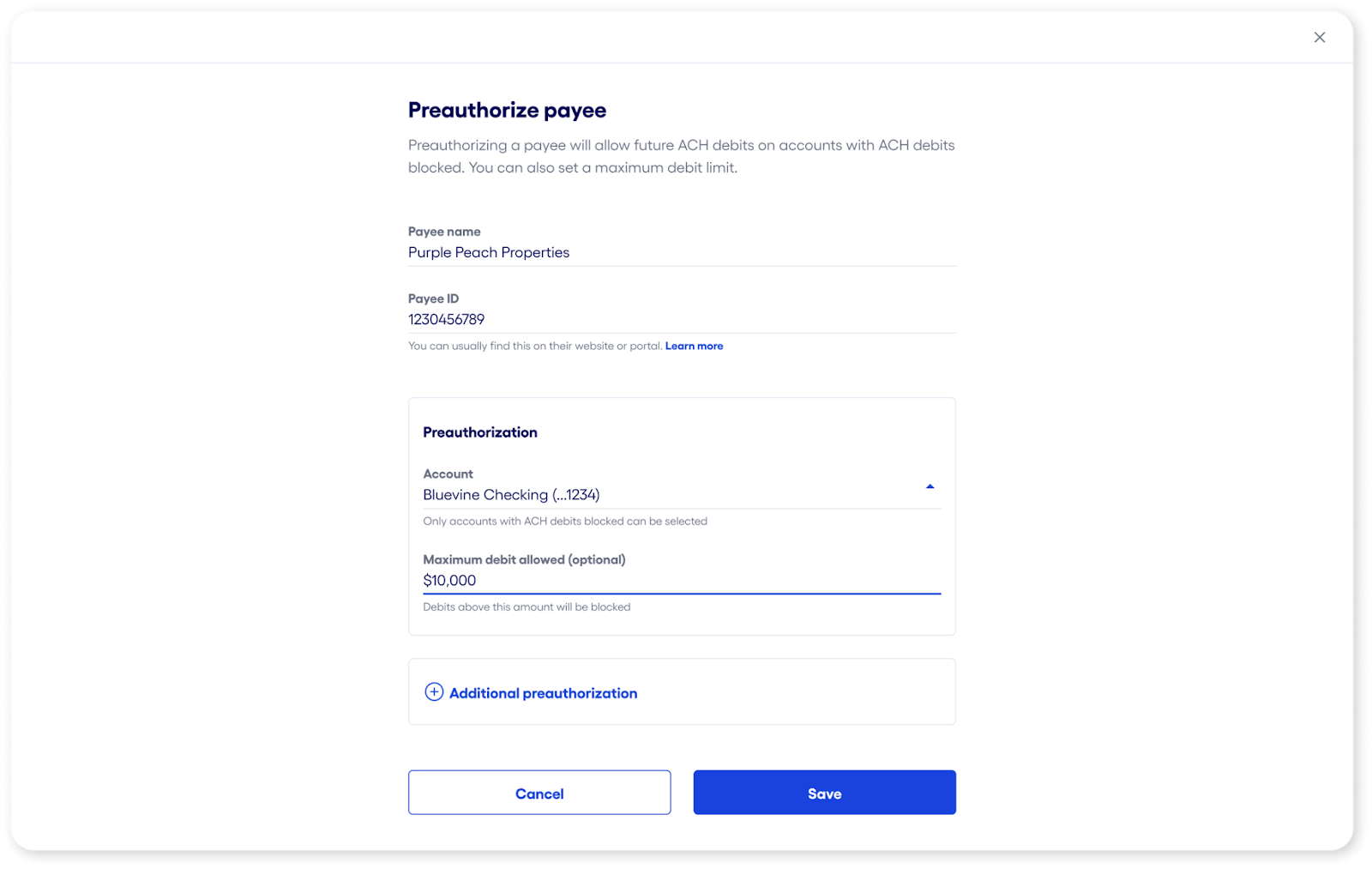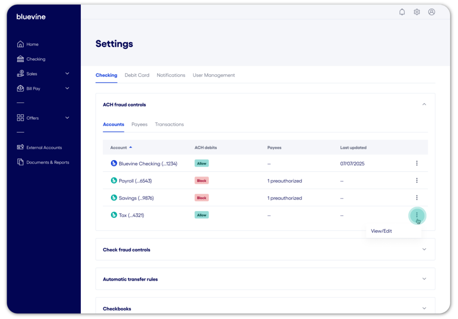 InformationBodyWith Bluevine Business Checking, you can safeguard your accounts against unauthorized or unwanted charges using ACH fraud controls. From your Bluevine dashboard, you have the ability to configure custom ACH debit settings and permissions both on the account level and by payee, giving you more control over how and when your accounts are debited. Account-level ACH fraud controls Account-level ACH controls allow you to designate how each account/sub-account handles ACH debits generally (allow/block) or set ACH amount limits that trigger your review (monitor): Allow: All ACH debits are paid unless the payee is on your blocked list or the account doesn’t have enough funds.Block: All ACH debits are automatically returned unless you’ve specifically pre-authorized that payee and dollar limit.Monitor: Available to Bluevine Premier customers, set dollar-amount triggers for ACH debits to be raised for your review, and rules for how to handle it if you don't take action. How to view account-level ACH fraud controls You can locate your ACH fraud controls settings by following the steps below: Sign in to your Bluevine dashboard via desktop or mobile browser.1 Select the settings icon in the upper right-hand corner. In Settings, select the Checking tab. Select ACH fraud controls to expand the section. How to configure account-level ACH fraud controls Follow the steps below to change how ACH debits are handled by account/sub-account: Sign in to your Bluevine dashboard via desktop or mobile browser.1 Navigate to Settings > Checking > ACH fraud controls. Select the Accounts tab to display a list of your active accounts. Select the vertical ellipsis icon (⋮) next to the account you would like to manage and click View/Edit. Review the available options and select the appropriate setting: Allow, Block, or Monitor. If selecting Monitor, you’ll be prompted to enter a dollar amount that will trigger an ACH debit for your review. You can also designate how we handle review-triggered ACH debits when we don’t hear back from you. Click Continue to apply your new settings. A pop-up screen will appear to confirm the action. Select Done to return to Settings. Payee-level ACH controls In addition to account-level settings for ACH debits, you can block and pre-authorize ACH transactions by the individual payee. Payee-level ACH controls bypass the account’s configured setting when applicable. For example, if you block ACH debits on a sub-account, any pre-authorized payees will still be able to debit the account for the amount allowed, if specified. Conversely, any blocked payees will not be able to debit the account, even if ACH debits are allowed by default. How to block a payee To block a payee, they must have debited any of your account/sub-account(s) at least once. (If the debit was unauthorized, please contact us for assistance disputing the transaction and securing your account.) Blocking a payee will block any future ACH debit attempts from this payee across all account/sub-account(s). Follow the steps below to block a payee from initiating ACH debits: Sign in to your Bluevine dashboard via desktop or mobile browser.1 Select the Checking tab. Locate and select the transaction from the payee you would like to manage to open the Transaction details panel. Under the Quick actions section, select Block future debits. On the pop-up screen, select Confirm to block the payee or Back to cancel the action. Select Done to return to the transactions ledger or Manage account blocks to navigate to your ACH fraud control settings. An email confirmation will be sent to the account Administrator and any Authorized Users. When a payee has been blocked, you can select a corresponding transaction from the Checking transactions ledger to open the Transaction details panel. Within this panel, a note containing information about the ACH debit block will be visible, along with a link to your ACH fraud controls settings. How to view and manage payee-level ACH controls Follow the steps below to view and manage blocked and preauthorized payees: Sign in to your Bluevine dashboard via desktop or mobile browser.1 Navigate to Settings > Checking > ACH fraud controls. Select the Payees tab to display a list of payees with custom permissions. The status indicator adjacent to each payee will indicate if the payee has been blocked or preauthorized. To manage a payee’s setting, select the vertical ellipsis icon (⋮) next to the payee you would like to manage and select the appropriate action. On the pop-up screen, select Confirm to complete the action or Back to cancel. An email confirmation will be sent to the account Administrator and any Authorized Users. How to preauthorize payees Bluevine Plus and Premier plan customers can preauthorize individual payees to bypass account-level ACH blocks. (To preauthorize a payee, ACH debits must be blocked on at least one account/sub-account.) You can set multiple controls for each payee. These controls include the ability to: Select which account/sub-account(s) with ACH debits blocked you would like the payee to debit from Set a maximum debit limit that the payee can debit at once (optional) Follow the steps below to set up and manage payee preauthorization: Sign in to your Bluevine dashboard via desktop or mobile browser.1 Navigate to Settings > Checking > ACH fraud controls. Select the Payees tab. Click the Preauthorize payee button. Fill out the form with the payee’s details and preauthorization settings. Note: The Payee ID, also referred to as the ACH Company ID, can be found in the following ways: If the payee has previously debited the account via ACH, the Payee ID can be located on the transactions ledger within the Checking page. If the payee has not yet debited the account via ACH, please refer to the FAQs below for more information. Select Save to confirm the preauthorization. An email confirmation be sent to the account Administrator when a payee preauthorization i