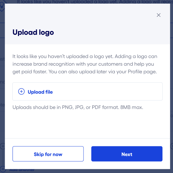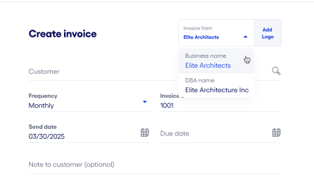 InformationBodyOverview You can personalize your invoices and estimates by adding your business logo and DBA (Doing Business As) name. These features help your business look professional, build customer trust, and ensure every payment request is instantly recognizable. Adding or updating your logo allows you to present a consistent, polished brand across all invoices and profile settings. You can upload, crop, and save your logo once — and it will appear automatically on all new invoices. If your customers know your business by a different name, you can also add your DBA name. This ensures that your invoices reflect the name your customers are familiar with, helping prevent confusion and reinforcing your brand identity. How to manage Logo Logo in Invoices or Estimates First time adding a Logo in an Invoice. Choose which product the logo is needed in For invoices: Go to Sales > Invoice. Select a draft invoice or select Create Invoice. For estimates: Go to Sales > Estimates Select a draft estimate or select Create Estimate. On the top right corner, select Add Logo. Logo pop up will appear. Select Upload File. Select a file from your device files. Note: Accepted formats PNG, JPG, or PDF. 8MB max. Select Next. Adjust the logo by cropping or repositioning as needed. Select Save. Logo has been added, please note that it will appear and can be updated in your profile settings as well. Editing Logo in Invoices or Estimates Choose where logo needs to be edited: Invoices: Go to Sales > Invoices. Create a new Invoice or open a draft Invoice. Estimates: Go to Sales > Estimates. Create a new estimate or open a draft estimate. Hover over the logo and select the pencil icon. Add, delete, or edit the logo as needed. Select Save. The updated logo will appear in all applicable features, unless the logo was removed. Logo in Profile Settings First time adding a logo in profile settings. Go to Profile and select Personal and Company. Locate the logo near shipping details. Select Add Logo. Logo pop-up will appear. Select Upload File. Select a file from your device files. Note: Accepted formats PNG, JPG, or PDF. 8MB max. Select Next. Adjust the logo by cropping or repositioning as needed. Select Save. Logo has been added, please note that it will appear and can be updated in your Invoices and estimates as well. Editing logo in Profile Settings Go to Profile and select Personal and Company. Locate the logo near shipping details. Hover over the logo and select the pencil icon. You can add, delete, or edit the logo as needed. Select Save. Updated logo will appear in all applicable features, unless the logo was removed. How to manage DBA name Adding or updating DBA name for Invoices or Estimates Choose where DBA needs to be added: Invoices: Go to Sales > Invoices. Create a new invoice or open draft invoice. Estimates: Go to Sales > Estimates. Create a new estimate or open draft estimate. Select Business name dropdown on the top right next to logo. Note: This option will not appear if there is no DBA associated with the account in Bluevine. Select the desired DBA name. Note: This will become the default on Invoices or Estimates once selected. Business name has been updated to DBA name on the invoice or estimate. To edit the name, follow the same steps and select a different name from the business name drop-down. All product names, logos, brands, trademarks, and registered trademarks are property of their respective owners. By uploading a logo, you confirm that you own it or have permission to use it, and that its use does not infringe on any third-party rights. TitleHow to manage Logo and DBA name?URL NameHow-to-manage-Logo-and-DBA-namePropertiesPublication StatusPublishedArticle Record TypeHelp Center